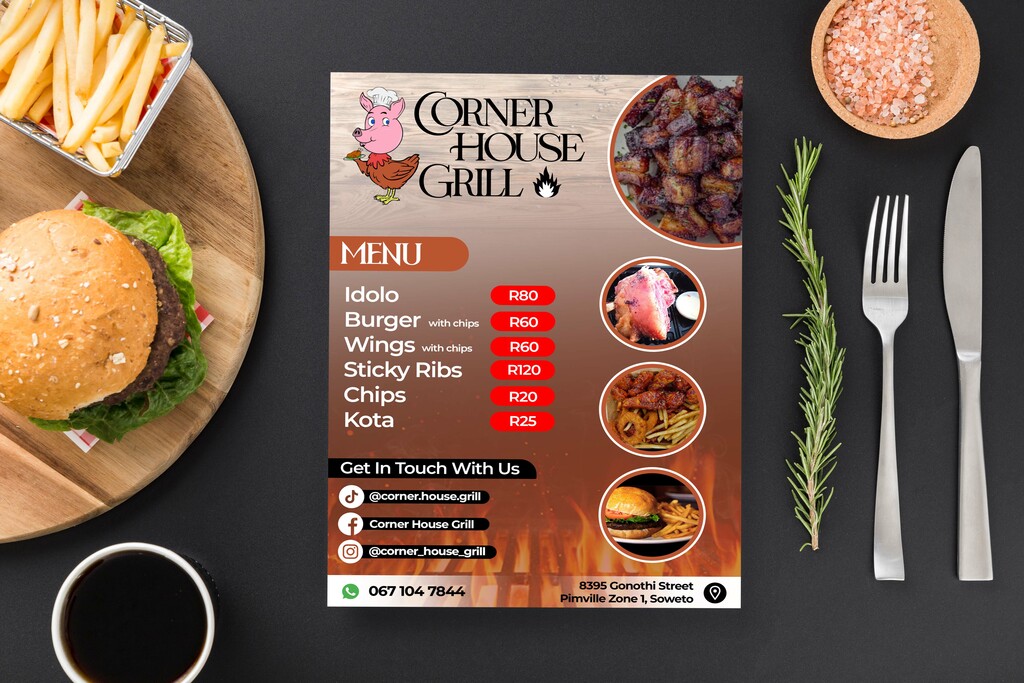 Corner House Grill, located in Pimville, Soweto, boasts a vibrant identity featuring a playful logo of a chicken with a pig's head. This unique design reflects the fast food joint's specialization in delicious chicken and pork dishes, ensuring a memorable brand presence.